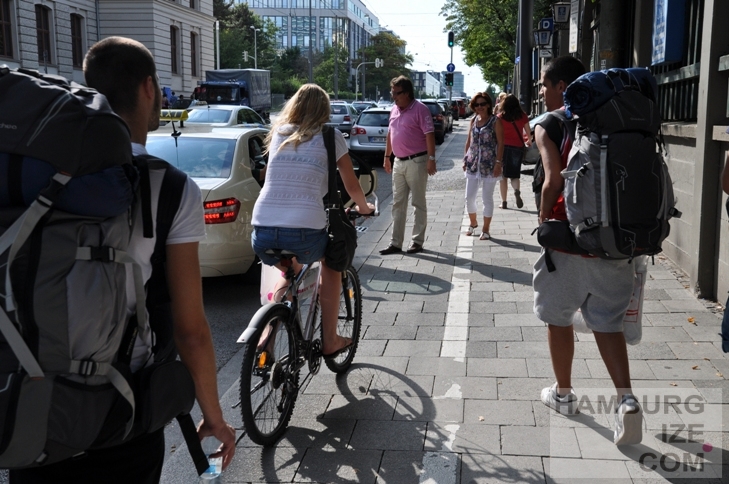 Die Polizei und die Autofahrer in der "Radlhauptstadt" sind aber Hamburger Verhältnisse bezüglich der Anwendung der Radwegbenutzungspflicht nicht gewohnt. Im Vergleich mit Hamburg hat München nur wenige Straßen vom Radwegzwang befreit. Es geht nach Autoverkehrsmengen und Autoverkehrsfluss, nicht nach der Befahrbarkeit der Fakeradwege. Gute Beispiele sind Arnulfstraße vor dem Augustiner-Keller oder Marsstraße an der Spatenbrauerei, aber auch die Lindwurmstraße und Boschetsrieder Straße.