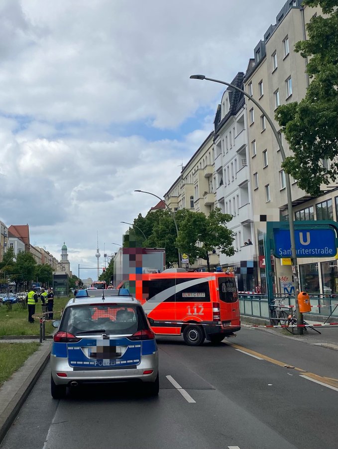 Das zweite Zeitungsbild mit dem Twitterfoto der Berliner Feuerwehr zeigt im Bildhintergrund den Alex. Rechts das U-Bahn-Schild Samariterstraße. https://pbs.twimg.com/media/E2ZCDpmW…pg&name=900x900